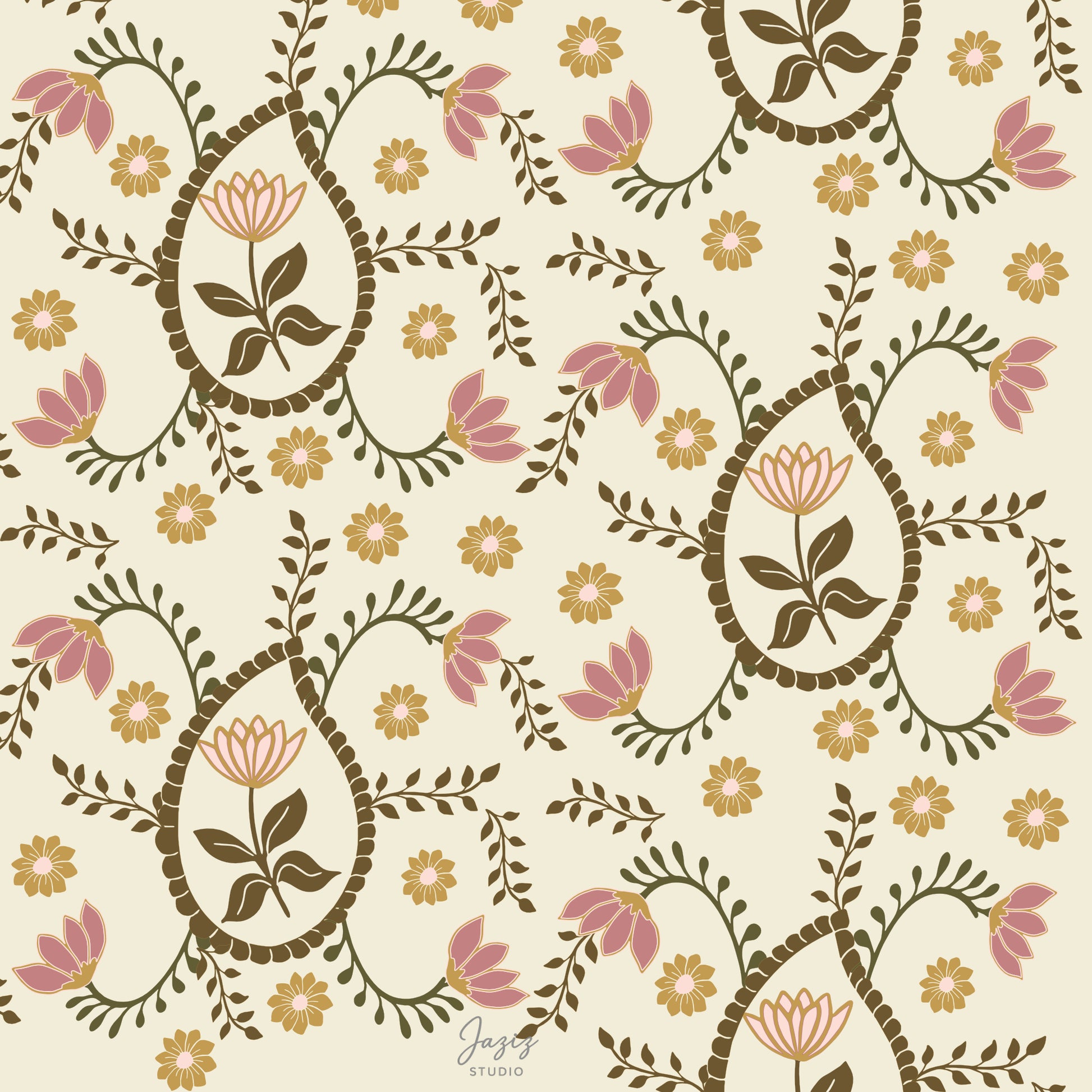 A decorative paisley floral pattern in a warm Ivory Honey colourway, inspired by classic ornamental and Art Nouveau details. Soft florals and flowing vines make this design suitable for wallpapers, surface design, stationery, and creative projects.